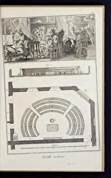 The image illustrates an art school with both active artists and a detailed floor plan. C. N. Cochin created the drawing, and D. L. Fronde engraved it, representing the style and educational spaces of the 18th century.