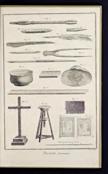 The page features a collection of labeled figures illustrating various drawing instruments used in the 18th century. Each figure represents a specific tool, ranging from brushes to equipment for drafting and measuring. The image is aimed at educating readers about the different tools used in artistic practices.