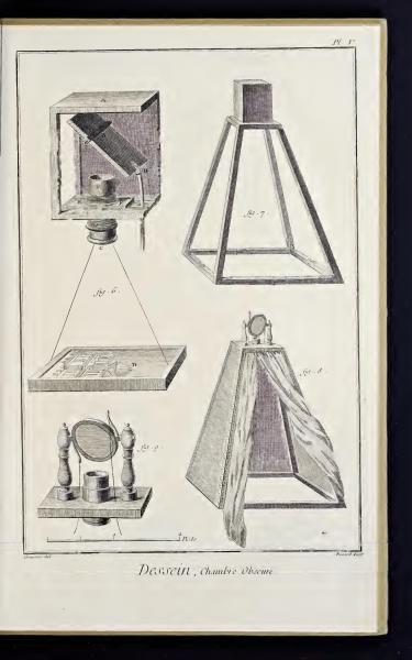 The text titled "Drawing, Camera Obscura" accompanies detailed illustrations of various components of a camera obscura. It provides insight into the construction and functioning of early image projection devices used in art and drawing during the 18th century.