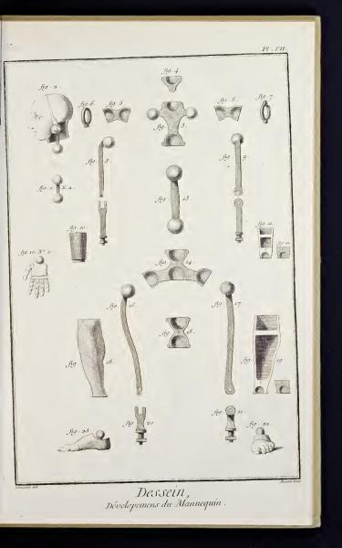 The text describes the "Drawing, Developments of the Mannequin"—a depiction of various parts and features of a mannequin used for artistic study. Each part is labeled to help with understanding or constructing the mannequin from various components.