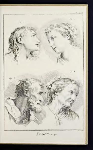 The page features labeled sketches depicting the different ages of human life through four profiles. Each sketch is numbered and represents various stages from youth to old age. The text is in French, translating to 'Drawing, the Ages.'