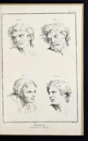 The image contains sketches illustrating different facial expressions to demonstrate the expression of passions in art. Each of the four figures provides an example of how emotions can be represented in a drawing. The title suggests a focus on the artistic depiction of human emotions.