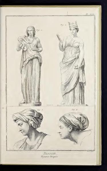 The image contains Plate XXIX featuring sketches of draped figures labeled as figures 1 to 4. It focuses on the study of draped human forms, a common practice in classical art education. The text translates to "Drawing: Draped Figures."