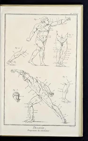 This page illustrates the proportions of a gladiator in various poses and angles, including full body and specific anatomical parts. It's a study in human anatomy meant for artists to understand the dynamics of the human form in motion.