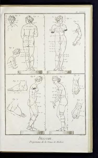 The text describes the drawings and proportions of the Venus de Medici. It indicates a focus on classical art and its detailed study of anatomical proportions. The drawings are highly annotated, suggesting an instructional or analytical purpose.