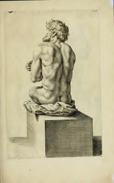 The image includes the text 'C1', which likely functions as a reference or label. The engraving depicts a detailed study of a male figure's back, suitable for anatomical education. The artistic style and subject support the book's objective of teaching painting and drawing techniques, particularly in understanding human anatomy.