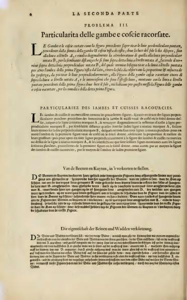 - There are multiple languages on the page (Italian, French, Dutch, and German), each giving instructions on artistic anatomical proportions.