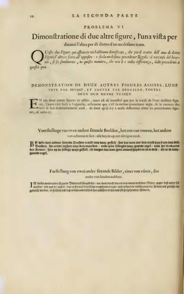Translation Notes: The original text includes Italian, French, Dutch, and German translations of the same instructional content related to figure drawing techniques. The word 'dimostrazione' in Italian and its equivalents in other languages can be translated as 'demonstration' or 'presentation' of artistic figures, referring to a show or education on how to pose modeled figures in art.