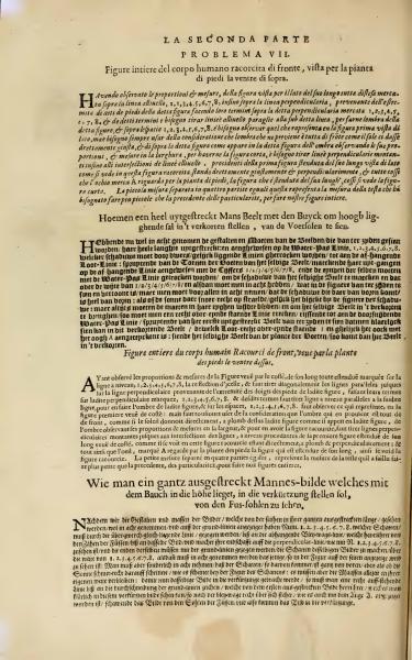 Having observed the proportions and measures, the stretched figure on its side is laid along a marked line, 1, 2, 3, 4, 5, 6, 7, 8, and then extended along the perpendicular line coming from the extremity of the feet of the figure. Create their limits along the marked perpendicular line, 1, 2, 3, 4, 5, 6, 7, 8. From these points, draw lines parallel to that line to cast the shadow of the figure, over spaces 1, 2, 3, 4, 5, 6, 7, 8. Always consider the shadow that follows from the front, like the sun on it, to provide the proportions and measures. Observe the shadow in the figure while maintaining the proportions to achieve a foreshortened figure, making the lines perpendicular up to intersections, exactly as presented. The small measure is divided into four equal parts to represent the head's size, which should be smaller than the previous parts for our internal figures.