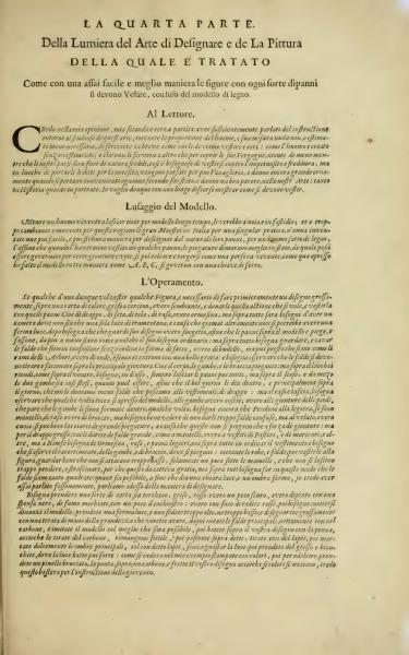 In my opinion, in my second and third parts, I have sufficiently talked about the instructions regarding the drawing in this art, touching on human proportions, their reasons, or instructions, in order to be written; briefly, as we say we write an essay on how man is created without shame, and how humans, unlike anything else, cover their nudity; most garments are cold by nature, and they need to be worn to protect against the rigor of coldness, but instead of being worn out of necessity, they are used simply for decoration and give a grand appearance when worn appropriately. In our art, this is reflected in both historical and portrait works. Hence, I desire to show how one must dress figures with a long discourse.