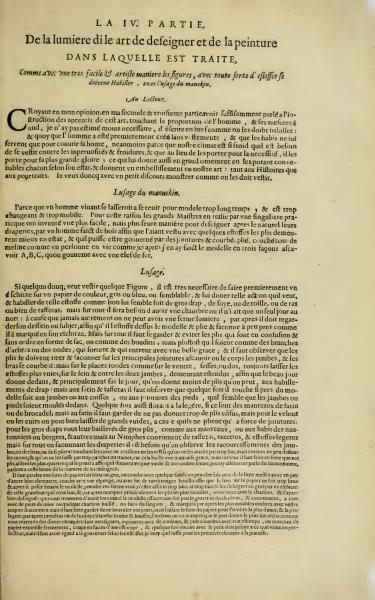 Believing in my opinion, in the second and third part having sufficiently spoken of the instruction of the apprentices of this art, concerning the proportion of man, and his measures in nude, I have not deemed it less necessary to briefly write how one should dress them: and although man was initially created without clothing, and garments only serve to cover its shame, nevertheless because our climate is cold and it is necessary to protect against the improprieties and chills, and instead of being worn for necessity, they are worn for greater glory; this also gives a great ornament in carrying them conveniently each according to his state, and gives an embellishment in our art: both in histories and portraits. I therefore want to show with a small discourse how one should dress them.