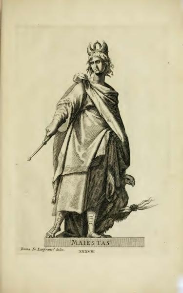 The text identifies the illustration as drawn by Giovanni Lanfranco in Rome, depicting a theme of majesty. The inscription 'MAIESTAS' highlights the subject’s grand and authoritative nature. The inclusion of Roman numerals suggests an organized series or collection related to art or anatomy from the period described in the book's context.