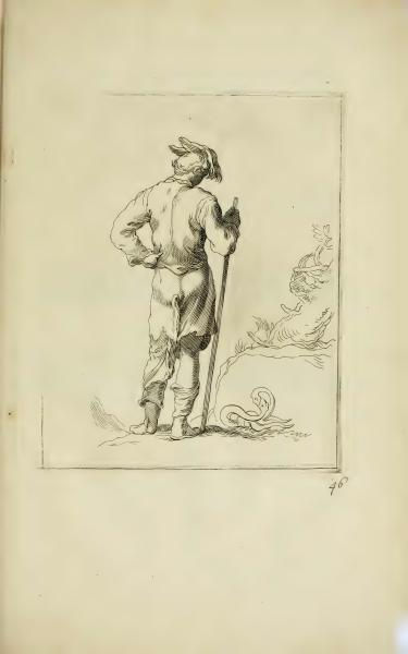 76 Page Summary: The page shows the number '76' and features an illustration of a man standing with a staff, created in a line work style. This appears to be part of a book on artistic techniques. << Go to previous page Go to Beginning of this Book Go to Index of this Book's pages Go to list of Books Go to next page >>