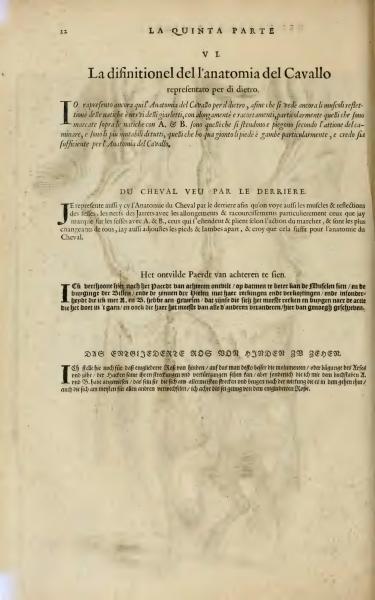 The text describes the anatomy of a horse from the rear view in various languages, emphasizing the visibility of muscles and nerves. It explains the mobility and variability of certain parts, marked as A and B, particularly during walking. The descriptions mention the extension and contraction of muscles and the addition of details such as feet and legs for a comprehensive understanding of horse anatomy.