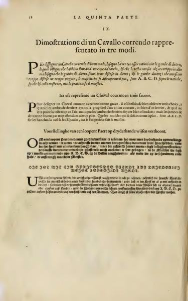 The document provides guidance on drawing a running horse in three different descriptions across Italian, French, Dutch, and German. It emphasizes the observation of the horse’s leg positions and the prominence of certain muscles on the body, referencing specific areas like the back, shoulders, and neck. The text concludes that practical experience is crucial for mastering the technique.