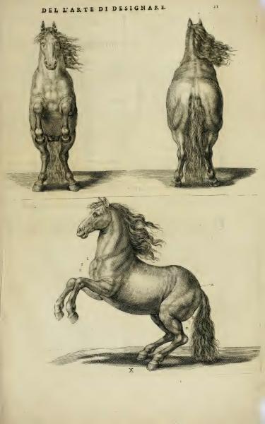 On the Art of Drawing Page Summary: The text is a heading in Italian, which translates to 'On the Art of Drawing.' It accompanies detailed anatomical illustrations that depict horses from different angles, meant to teach or demonstrate drawing techniques. << Go to previous page Go to Beginning of this Book Go to Index of this Book's pages Go to list of Books Go to next page >>