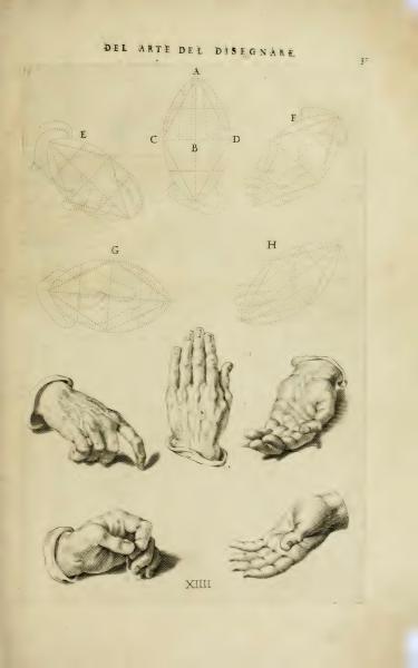 The text includes a heading "Of the Art of Drawing" and letters labeling various images. The images likely serve as instructional aids in a historical art book, demonstrating techniques for drawing hands.