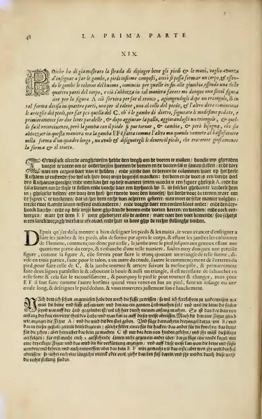 Since I have already shown the method of painting feet and hands well, I want to advance by teaching how to make the legs and feet together in one composition, so that a body can be formed. Because the legs are the columns of the human body, I begin with them up to the knees, as they are one of the four parts of the body. By this method, you will then create a similar figure, meaning for figure A. This will serve to make the trunk, by adding a triangle of such a form, divided into four parts: one for the heel, one for the ankle, and the other where the joints of the feet begin, to then create the back of the leg, follow the same steps, and firstly make two parallel lines, and then add the ball, adding a triangle, and now it will shorten it, because the leg with the foot can turn around & change. It's necessary that it be sketched in a certain way and the other leg will be like the others, but when you reach the bend, make the shape of a long square, and an oval, and carefully draw inside the foot, you'll find correctly the shape & design.