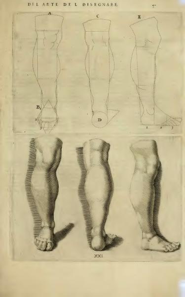 The page is titled 'On the Art of Drawing' and includes several letters and numbers likely used to reference parts of the illustrations. It appears to be a guide on drawing proportions and structures of human legs, with reference to specific sketches seen on this page.