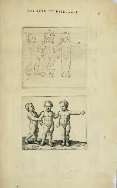 The text, titled "On the Art of Drawing," introduces the concept of drawing techniques related to human anatomy. This title connects to the images on the page, which provide visual instruction in drawing proportions and forms. The images illustrate both basic and advanced concepts in figure drawing.