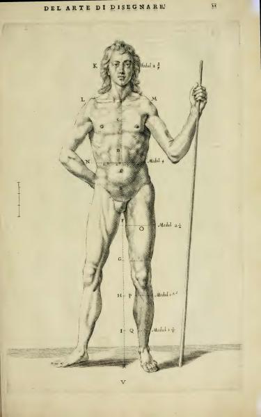 The image includes labels in Italian referring to drawing modules with various fractions, focusing on the study of artistic proportions. It serves as an educational tool for understanding human anatomy and proportion in art. This aligns with the book’s purpose of providing drawing instructions related to the human body.