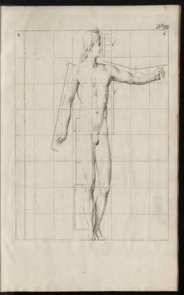 Number VIII Page Summary: The image includes a drawing labeled as 'Number VIII.' It is a depiction of a male human figure, divided by a grid to study body proportions. << Go to previous page Go to Beginning of this Book Go to Index of this Book's pages Go to list of Books Go to next page >>