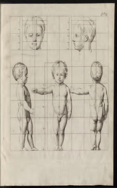 The page is labeled "Page CLVI" and features detailed anatomical illustrations of a child, focusing on proportions. There are multiple views, including frontal, profile, and rear of the head and body, all gridded for accuracy. This is part of "The Proportions of the Human Body" by Jacob deWit from 1790.