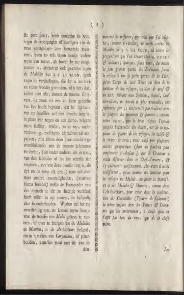 manner of measuring that I adopted above; nor also against the Modules of J. C. LE BLON, nor against the proportions found in A. DURER and elsewhere; although, if not all, at least the majority of writers set the face as such a small part of the head, that a Body of eight Heads is well the height of ten faces; instead of nine and a third following my system, which, except for correction, seems to me the most acceptable, not only because of its particular conformity with most members & parts; for instance, the arm from the shoulder to the fingertip, is the length of four of these faces, the thigh & the trunk three; but also by several other proportions (more fully discussed below) which the Creator has wanted to observe in this masterpiece, & consistently maintains there. Furthermore, it is indifferent to me whether one names my height for faces a Module, or that one transfers it to Modules & Minutes, known in Architecture, to have the same measure with the Pillars & Columns surrounding them; because it is not so much about the name, but about the thing itself.