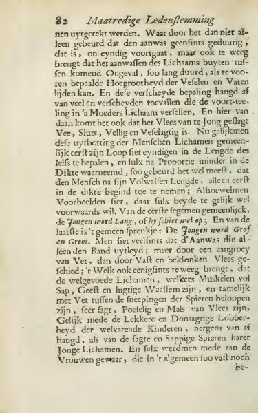 whereby not only does growth not continually proceed, that is, endlessly; but also it creates a situation where the growth of the body outside of unexpected accidents lasts as long as the predefined size of the vessels and veins can endure. This various determination depends on many diverse occurrences that affect development in the mother's body. Hence, it is noted that the meat of young livestock is tender, firm, and fibrous. Upon observing this common outbreak in human bodies, its progression appears to end in defining its length, similarly perceived in its proportion less in thickness; thus, it mostly occurs that a person, after achieving full length, only begins to increase in thickness. Although there are examples where both progress equally. In the first instances, the saying goes: The young grow long or grow up; and for the latter, it is commonly said: The young become sturdy and large. Often, one sees that the increase is mostly due to the enlargement of fat rather than dense and solid flesh; this somewhat causes well-nourished bodies, whose muscles are full of juice and a light exhalation, to be somewhat soft, fluffy, and tender in flesh. In the same way, the delicate and soft plumpness of thriving children depends on nothing but the soft and juicy muscles of their young bodies. This is also observed in women, who are generally neither firm nor be-