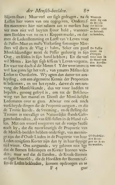... remain standing; But rather behave as previously advised by us. Nevertheless, we must note how one might lose track when creating figures with 10 and 11 heads, and that one forsakes the Proportion and Life for measuring with the Compass and seeks the foolish approval of some masters who wish to lower their standards. A good student of human studies must keep the Compass in view, and rarely in hand; and those who measure much might easily forget themselves and their life. But why all this Measuring? Everyone surely knows how entirely wrong it is to judge someone’s malformed members. We thus strive to gain general knowledge of Proportions to then form the basis of human studies, to the extent that we initially intended, offering enough material to move on to the study and examination of the makeup and function of human limbs. Wherein considerations of proportion, facial features, movement, and the positions of faces in both random and Natural postures intertwine, falling naturally into place. In addition, we assert based on previous studies that some old thinkers believe that in terms of proportion, the limbs of older people are somewhat shorter than they would have been in their prime. As for us, we do not believe that the bones shrink and can become smaller; but rather that the tendons, cartilage, and soft tissues, which cover the joints, can dry out and thus affect the limbs...