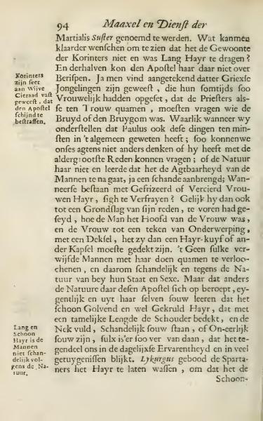 What could be clearer than seeing that it was not the custom of the Corinthians to wear long hair? Thus, the Apostle could not reproach them for this. It is noted that there were Greek youths who sometimes dressed so femininely that when the priests came to celebrate marriage, they had to ask who the bride or groom was. Indeed, when we assume that Paul also knew these things generally, we cannot think otherwise but that he must have been able to argue this from the most convincing reasons; whether nature taught them that the dignity of men suffers, or even brings disgrace, when they adorn themselves with curled or decorated women's hair. He had previously laid down the premise that man was the head of the woman, and the woman as a sign of submission should be covered with a veil, whether it be a head-dress or some other cap. Such effeminate men thus denied their nature, and it was disgraceful and against the natural order of their rank and sex. But that nature, to which this Apostle actually appeals, would teach otherwise that beautiful, flowing, and well-curled hair, that covers the shoulder to a decent length and fills the neck, would disgracefully stand, or dishonestly be, is far from the truth, as our daily experience and many testimonies show. Lycurgus instructed the Spartans to wash their hair to enhance and strengthen its beauty.