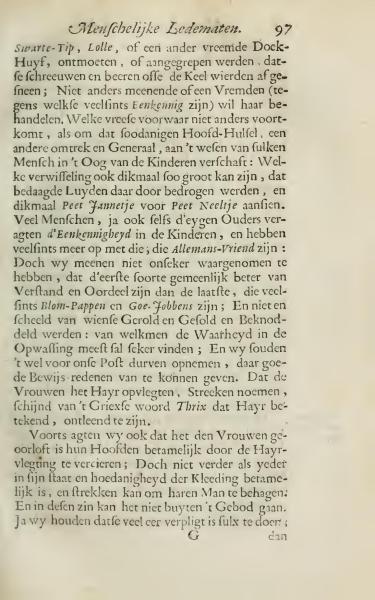 Black-Tip, Lolle, or another strange Dock-Huyf, encounter or are grasped, causing them to scream or cry out as the Throat is cut; Not meaning anything else, or a Stranger (against whom many are Shy) desires to handle them. This fear indeed does not come forth otherwise, than because such a Head-Covering, a different contour and General, is provided to the Being of such a Person in the Eyes of the Children: This exchange can sometimes be so great, that elderly People are deceived, and sometimes Peet Jannetje is mistaken for Peet Neeltje. Many People, yes even sometimes their own Parents despise the Shyness in the Children, and have much more with those who are Allemans-Friend (Everyone's Friend); But we have indeed not uncertainly observed, that the first sort are generally better in Understanding and Judgment than the latter, who are often Bloom-Pappens and Goe-Jobbens; And not divided by whom the Announced and Followed and Harassed were: of whom the Truth in the Upbringing will most certainly be found; And we would dare to assume our Position, where good Proof reasons can be given. That the Women laid the Hair, called Weaving, seemingly derived from the Greek word Thrix meaning Hair.