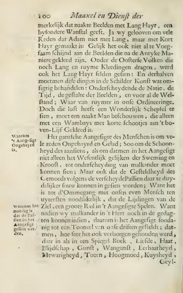 The entire appearance of a person is for many reasons unhaired and loaded; both for the beauty of appearance, and because in the face one should not only see the essential likeness of swimming and offspring for distinguishing one from another; but also that the state of the mind according to various passions can be more evidently seen there; for it is extremely necessary for our interaction with our fellow humans that the sufferings of the soul play a great role in the face. Since we cannot peer into each other's heart or thoughts, the face is thus presented as a stage of our impulses; so that no matter how much it may be hidden, it will be revealed as in a mirror book: love, hate, joy, favor, opposition, honor, pity, anger, pride, chastity,