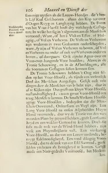 some appear like those Lion-Dogs, which have the whole Body Shaven, only the Head rough and Long-haired beyond the Eyes. The Form of the Forehead has three different types; In which it generally appears among Humans: Either it is Flat and Smooth, Hollow-like, or Full and Elevated. The Full and Elevated are again distinguished into two forms, because they are either Full and Elevated upwards, or Full and Elevated downwards, or both Elevated above and below, or generally. There are also Foreheads that hang Backwards and Forwards. As can be seen in the artistic depictions and illustrations, all these Types and Classes can be seen.