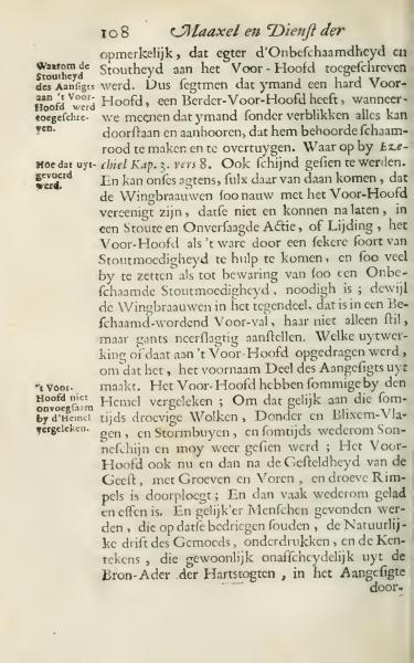It is remarkable that shamelessness and boldness are attributed to the forehead. Thus we say that someone has a hard forehead, a bold forehead, when we mean that someone can endure and listen to everything without flinching, which should make them blush and be convinced. As seen in Ezekiel Chapter 3, verse 8. This possibly comes from the idea that the eyebrows are so closely united with the forehead; they cannot help but stand in bold and undaunted action or suffering, as if being helped by a certain kind of daring courage, and adding as much as is necessary to maintain such unashamed boldness; while the eyebrows, on the contrary, in a blushing fall; however, they act quite desolately. Which impression if that is assigned to the forehead because it is the main part of the appearance. The forehead has been compared by some to the sky; because, just like those sometimes gloomy clouds, thunder, and lightning, and sometimes again sunshine and beautiful weather are seen; The forehead also occasionally shows the disposition of the mind, being plowed with furrows and wrinkles, and then often loaded again and becomes smooth. And likewise, people are found who would deceive by suppressing the natural impulses of emotions, and the signs that usually come inseparably from the Source-Vein of Passions in the Facial Appearance...