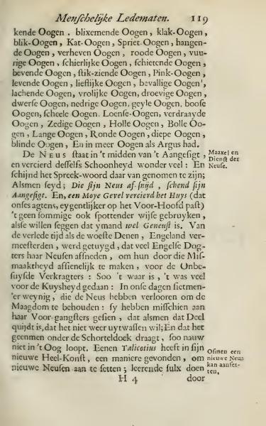 The text describes a variety of human eye characteristics, each with unique descriptions such as flashing or cross-eyed. It also discusses the significance of the nose to facial beauty and recounts historical practices among the Danes and English related to noses, implying cultural and beauty standards of the time. Additionally, a surgical method for attaching new noses is referenced, highlighting early reconstructive surgery practices.