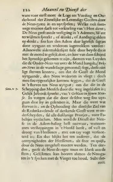 Firstly, air must flow through the nostrils to nourish and maintain the sensory and lively spirits; some even believe it helps cool the heart. The nose also plays a role in breathing: while one speaks, drinks, or attentively thinks elsewhere, the breath can gently pass out and be drawn back in. Although, it is easiest to do both simultaneously with the mouth, which has led to the belief that people with an extended nose over the mouth (commonly known as "hook-nose" in popular discourse) are less prone to dying quickly, as the spirit exiting the mouth re-enters the nose. However, it might be said more accurately that the spirit exits through the nose at death, because it was initially breathed in through this path in the creation of man, as mentioned by Job with 'the breath in the nostrils.' This suggests that it leaves via the same path it entered. However, those who know what dying is and can distinguish between physical and thinking mind will dismiss such sayings as fables. The service of the nose in breathing becomes most apparent when one experiences blockages in the head or is suffering from dry and congested brains. Thus, it becomes clear that the impurities of the brain, like mucus and phlegm, must be expelled through the nose. Furthermore, the nose provides the correct tone and sound to the voice; as one can hear if one pinches the nostrils while speaking.