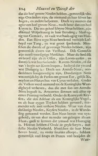 those with very large noses generally are quick to judge, often pleasing only themselves while ridiculing others. However, we believe that indeed having a very large nose is better than having a very small one. Those with very small noses are often indecisive in their counsel, submissive of spirit, and frequently somewhat hook-like in their hands. A stiff straight nose often indicates a loose tongue and a tendency to speak grandly. People with dwarf-like or crooked noses are generally stubborn of mind. Those with thick noses are mostly cautious people. However, those very thick and broad like oxen are sluggish and sometimes a little lethargic. Raven-like noses, or those that curve from the beginning, indicate someone somewhat haughty: A person with an eagle-like nose is judged to be proud. Such a nose was once a great honor among the Persians, as Xenophon and Plutarch recount of Cyrus. Amongst those peoples, none were elevated to royal dignity except those endowed with such an eagle nose. Artaxerxes was even depicted with it on a coin. Among the Roman Caesars, who carried the Eagle as a Royal Bird and as their own emblem, many had prominent noses. Hence, such noses, Caesar's Noses, were called in conversation. A nose that is outwardly arched, then curves downwards like a Rooster, indicates someone somewhat lascivious. Therefore the Ancients depicted lecherous Satyrs with such noses. People whose noses are broad at the top and taper below often jest and talk much beside the point.