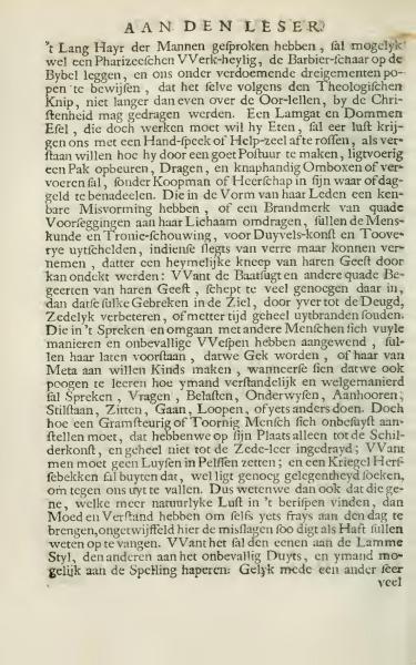 Talking about the long hair of men may well displease a Pharisaic hypocrite, who might threaten us with the barber's scissors on the Bible, to prove to us by theological arguments, that it should not be worn longer than just over the earlobes, according to Christian decency. A dimwit and dumb donkey who nevertheless needs to work if he wants to eat, would sooner be eager to attack us with hands or ropes, rather than understand how he should, with good posture, gracefully lift a package, carry, box, or transport it without harming the merchant's or lord's goods or daily wage. Those who have a visible deformity in the shape of their limbs, or bear a stigma from unfortunate predictions on their body, could dismiss the knowledge of human studies and facial observation as a devil's art and witchcraft. If they could only hear from afar that there is a subtle art that could be discerned by their gifts: Because the profit-driven and other evil desires of their gifts find too much pleasure in it, that they would want to morally improve such deficiencies in the soul, through virtues, ultimately burning out over time. Those who have adopted foul manners and unfashionable expressions in their speech and dealings with others will have us think they're mad, or want to fool them into behaving childishly unless we also attempt to teach someone how to speak, ask, burden, instruct, listen, stand still, sit, walk, or do something else in a wise and courteous manner. How a monstrous or angry person must act unsensibly is detailed in its place only for painting, and not at all for ethical conduct: For one must not put lice in pelts; and a cantankerous outburst will, beyond that, surely seek opportunities to oppose us. So we also know that those who find more natural enjoyment in rebuking than in having the courage and wisdom to bring forth something beautiful themselves, will undoubtedly know how to pick up the setbacks here as close as the haft. For some may stumble on the Lame Style, others on the ungraceful Dutch, and possibly someone may falter over their spelling: Similarly, another very much so.