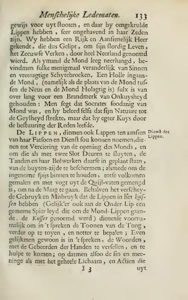 The text discusses the characteristics and functions of human lips and mouths. It describes how certain physical traits, like a concave mouth, have been historically viewed as indicative of moral traits, such as fickleness or cowardice. Additionally, it explores the practical functions of lips in speaking and eating, also touching on their symbolic roles in communication.