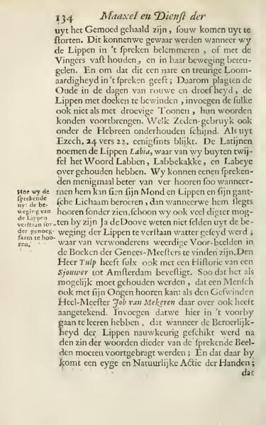 the emotions removed, would emerge to disturb. This could be observed when we restrain the lips in speech, or hold them with the fingers, thus limiting their movement. Because this causes a gloomy and sad manner of speaking, the ancients used to cover the lips with cloths during days of mourning and sadness, so that they could only express themselves in mournful tones. This practice was also observed among the Hebrews, as evidenced in Ezechiel 24:22. The Latins call the lips 'Labia', from which we likely derive the words 'Labben', 'Labberkakke', and 'Labey'. We indeed hear a speaker much better when we can see their mouth and lips and entire body move, than when we can only hear them without seeing, although even the deaf can sometimes understand the movements of the lips to grasp what is being said. Remarkable examples of this are found in the books of medical experts. Dr. Tulp has also supported this with a story of a porter in Amsterdam. It is therefore considered possible that a person can also 'hear with their eyes', as recorded by the renowned surgeon Dr. Job van Mekeren. Thus, in passing, we learn here that when the activity of the lips is meticulously adapted to the meaning of the words to be expressed by the speaker, an appropriate and natural action of the hands accompanies this.