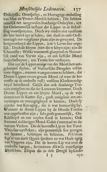 Regarding lips, some see innate flaws or natural virtues in humans, believing that thin lips and a large mouth, particularly where the upper rests on the lower, often signify courage. Such expressions somewhat resemble those of lions. On the other hand, thin lips and a small mouth, resembling those of cats, suggest a lack of ability and timidity, but they do possess a cat-like wit, which is somewhat mischievous. When thin lips become swollen near the canine teeth, this generally suggests a lack of nobility and a foul nature. Such a mouth and teeth set resemble that of a pig. Those whose upper lip and gum protrude greatly are often prone to ridicule, mockery, and criticism. Polemon notes they are harsh speakers and their fingers are somewhat hooked. Those whose upper lip slightly overhangs the lower often come across as cautious individuals. Aesop, notable in this virtue,