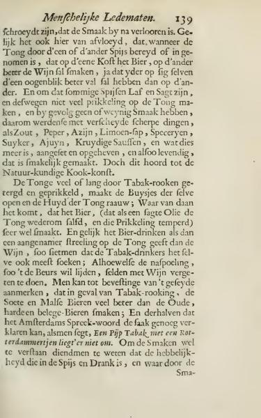 The tongue, when long exposed to tobacco smoke, gets irritated and pricked, opening the pores and causing the tongue's skin to become raw; thus, beer, acting like a soft oil, soothes the tongue and mellows the irritation, making it taste very good. Consequently, beer drinking gives a more pleasant sensation on the tongue than wine, which is why tobacco users often seek it. Although rinsing with wine isn't often preferred as it may strain finances, even though it rarely diminishes the taste. Notably, in terms of tobacco smoking, sweeter and milder beers taste much better than old, hard-aged beers. Therefore, the Amsterdam proverb that a pipe of tobacco with a small Rotterdam drink isn't a lie confirms this. To understand these tastes, one must know the preferences in food and drink and what enhances the taste.