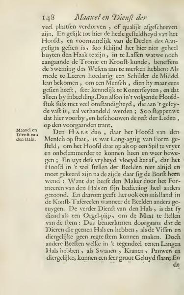 Now the Neck, where the Head of the human stands, is somewhat elongated in form, to allow the Head to move more freely and unhindered back and forth, like on a pivot. From this freedom stems the condition that when positioning statues, the Head need not always be turned to the side where the Chest turns: For the Creator has shown this very differently through the Formation of the Neck and its use. This also causes a discrepancy in Art Displays when the Statues testify otherwise. The additional Function of the Neck is that it serves as an Organ-pipe, to set the measure of the voice: Thus it is generally noted that animals without a Neck, like Fish and similar creatures, cannot make a correct sound. But other creatures which, on the contrary, have a Long Neck, like Swans, Cranes, Peacocks, and similar, can produce a very loud noise.