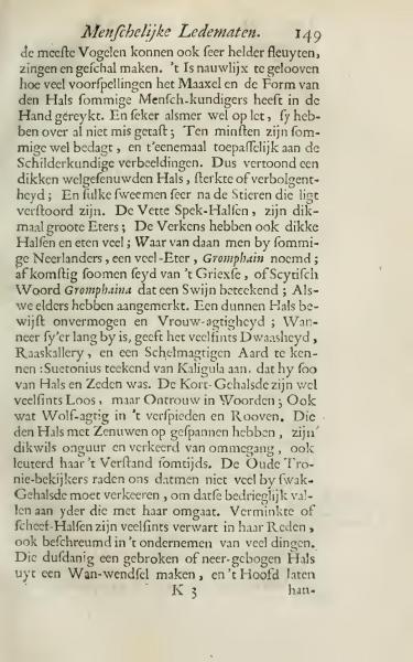 Most birds can also whistle very clearly, sing, and make vibrant sounds. It's hardly believable how much predictions about the shoulder blade and the form of the neck that some human scholars have accurately handed down. And certainly, when one pays attention, they are not mistaken at all; At least some are well thought out, and entirely applicable to artistic representations. Thus, a thick, well-muscled neck shows strength or indignation; And such traits resemble those of bulls that are slightly disturbed. The Fatty Neck People are often big eaters; Pigs also have thick necks and eat a lot; From which some Dutchmen, a voracious person, is called Gromphain, supposedly stemming from the Greek, or Scythian word Gromphaina, which means a pig, as others have noted. A thin neck shows impotence and effeminacy; When it is long, it often indicates folly, babble, and a playful nature: Suetonius describes Caligula as having such a neck and demeanor. The Short-Necked are often simple, but unfaithful in words; Also somewhat wolf-like in spying and stealing. Those with tightly strung necks are often unapproachable and awkward in company, also confusing their minds at times. The Old Inspectors advise us not to associate much with weak-necked people, as they may deceptively fall to anyone who associates with them. Mutilated or crooked necks are often confused in their speech and worried about undertaking many things. Those who create a broken or bent neck from a malicious act, and let the head hang..
