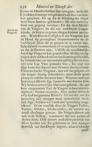 Arms and Hands have been observed, and in youth, many successful experiments have been made. To ensure that the hands work better, they are equipped with various types of grasping capability. Through the means of the fingers, which all have different lengths, small and large objects can be handled. Due to the flexibility of the fingers, the hand can adjust itself proportionally to the various items to be grasped and held. Thus, they can increase and decrease according to the shape; this necessity of the fingers forms the foundation. Certain tasks, which could not be carried out by the Hand, would not be possible if not for the fingers being separate but made from one piece of flesh. This is why using mittens, which are gloves without fingers, challenges dexterity and causes difficulties in handling; therefore, a mocking term is 'Eating Fish with Mittens.' We have known a truthful master who, in acknowledgment of the fingers' simplicity, named them finders, not knowing if it was the common word. Because this naming seemed proper to us, we have also noted it with attention. For truly, by the fingers, we sense, touch, find, and experience, making us aware of almost everything. The fingers also serve us in counting, as they aid in division and partition. Similarly, one typically begins with the thumb in action, thus it is without doubt...