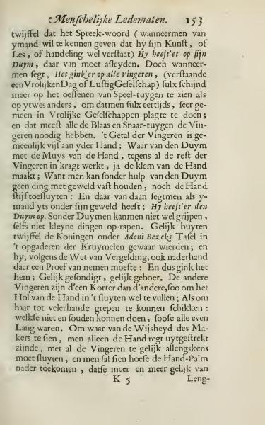 There is no doubt about the saying (when someone wants to demonstrate that they understand their art, or lesson, or craft) "He has it on his thumb," which means it's mastered. However, when it's said "It went on all fingers," (understanding a happy day or cheerful company) it seems more related to practicing musical instruments than anything else, because people commonly practiced this in cheerful gatherings; and most wind and string instruments require fingers. The number of fingers is generally five on each hand; where the thumb, together with the palm of the hand, works forcefully against all other fingers, even forming the grip of the hand; because without the help of the thumb, nothing can be held firmly, nor can the hand be closed tightly. And that's why it is said when someone has control over something; "He has his thumb on it." Without thumbs, one cannot grip well, not even pick up small things. Just as undoubtedly the kings under Adoni-Bezek's table became aware in gathering the crumbs; and he, according to the law of retribution, also had to undergo a test: and thus it went for him; As he sinned, so was he punished. The other fingers are one shorter than the other, to be able to fill the hollow of the hand well when closing; as well as to be able to position them for various grips: which they could not do if they were all the same length. To see the wisdom of the Creator, one should stretch the hand outright and gradually close all the fingers, and one will see how the palm of the hand proceeds and increasingly becomes equal to