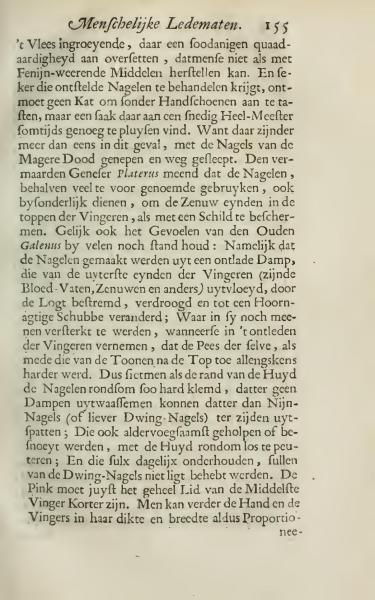 When the flesh grows inward, such a condition develops that can only be remedied with strong medicine. Someone handling damaged nails should never approach the task without gloves, sometimes needing the skill of an experienced surgeon. For those have dealt with nails of the Grim Reaper, captured, and removed with care. The famed physician Platerus thought that fingernails, aside from commonly known uses, serve particularly well for protecting the nerve endings at the tips of fingers, like a shield. The ancient Galen's feeling still holds among many, specifically, that nails are created from a release of vapor emitted from the finger tips (being the blood vessels, nerves, and others), dried by the air, and turned into a horny scale. They get strengthened when, during the dissection of fingers, they realize the tendons likewise become tougher towards the ends of the fingers and toes. Thus, if the edge of the skin grips the nails so tightly that no vapors can escape, minor nails (or rather forced nails) burst aside; These should be gently assisted or trimmed, loosening the skin around them; and if maintained daily, the forced nails do not become troublesome. The pinkie must be slightly shorter than the entire joint of the middle finger. Furthermore, the hand and fingers can be proportioned in their thickness and width as follows: