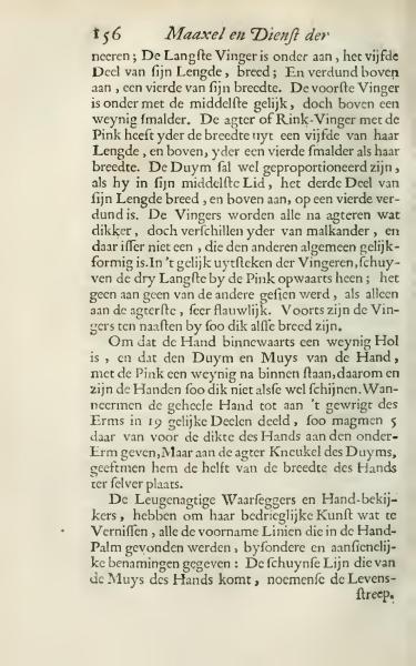 The text discusses the proportions of fingers, detailing how their widths compare to their lengths and how they vary between different fingers. It explains how the hand is structured, noting how the thumb and the inner part of the hand align, and provides measurements for dividing the hand's sections. Additionally, it mentions how palm readers often ascribe specific names to lines in the palm, with the 'Life Line' being one such example.