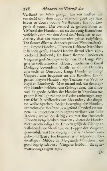 The text explores the function and nature of hands, associating various traits and characteristics with different hand shapes and sizes. It suggests that large hands indicate strength, while small hands suggest delicacy, and long fingers suggest craftsmanship. Additionally, the text reflects on how speech can be articulated with or without hand gestures, following Aristotle's teachings.